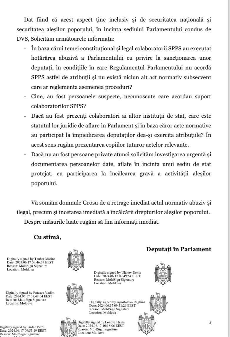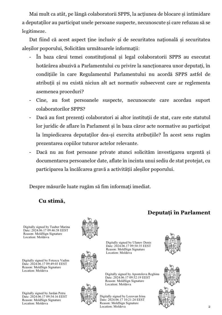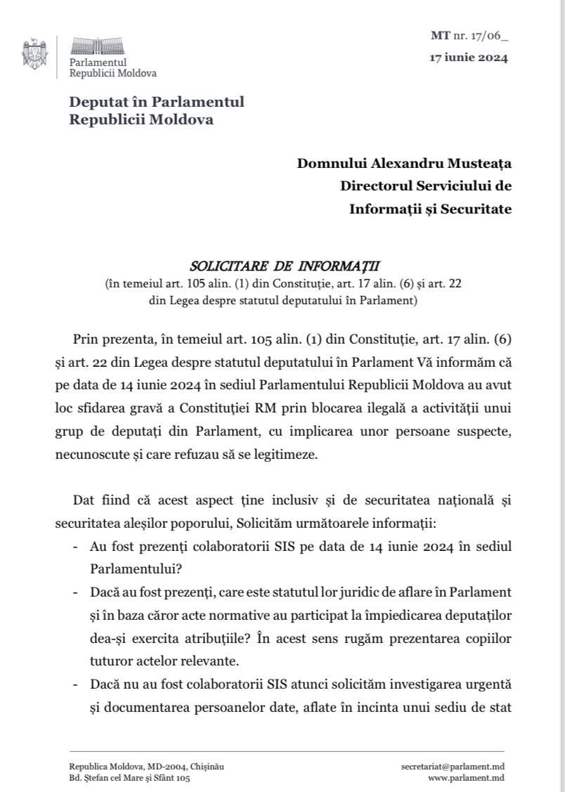 Amintim că deputații au fost împiedicați să intre în Parlament de către persoane necunoscute, fără uniforme speciale. În anchetă, ei cer ca Musteață să clarifice: reprezentanții SIS au fost prezenți în clădirea Parlamentului? Dacă da, care a fost statutul juridic și atribuțiile acestora? Dacă nu, atunci trebuie urgent să fie efectuată o anchetă și să se afle numele și statutul celor care au fost prezenți acolo, și au împiedicat deputații să meargă la locul lor de muncă legitim. Acțiunile lor pot fi calificate drept participare la o infracțiune gravă — obstrucționarea activităților oficialilor aleși.