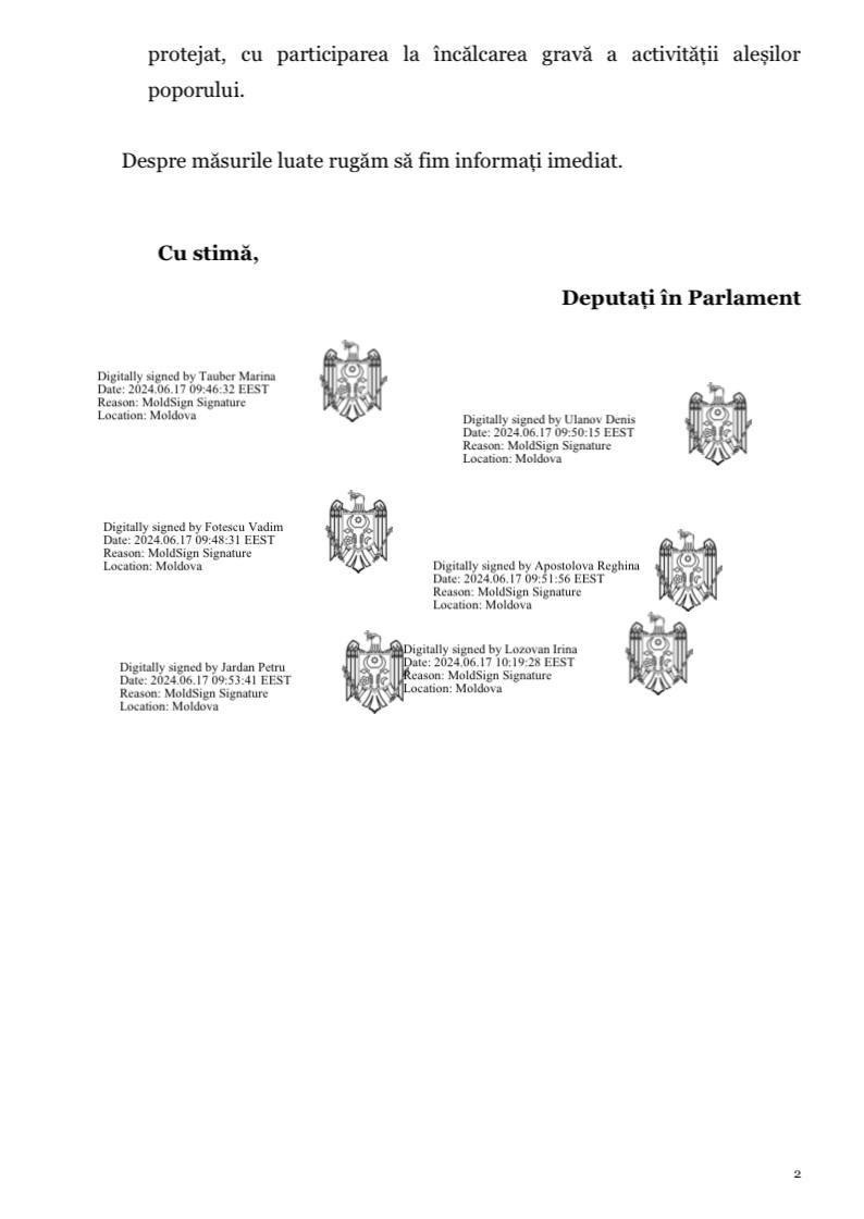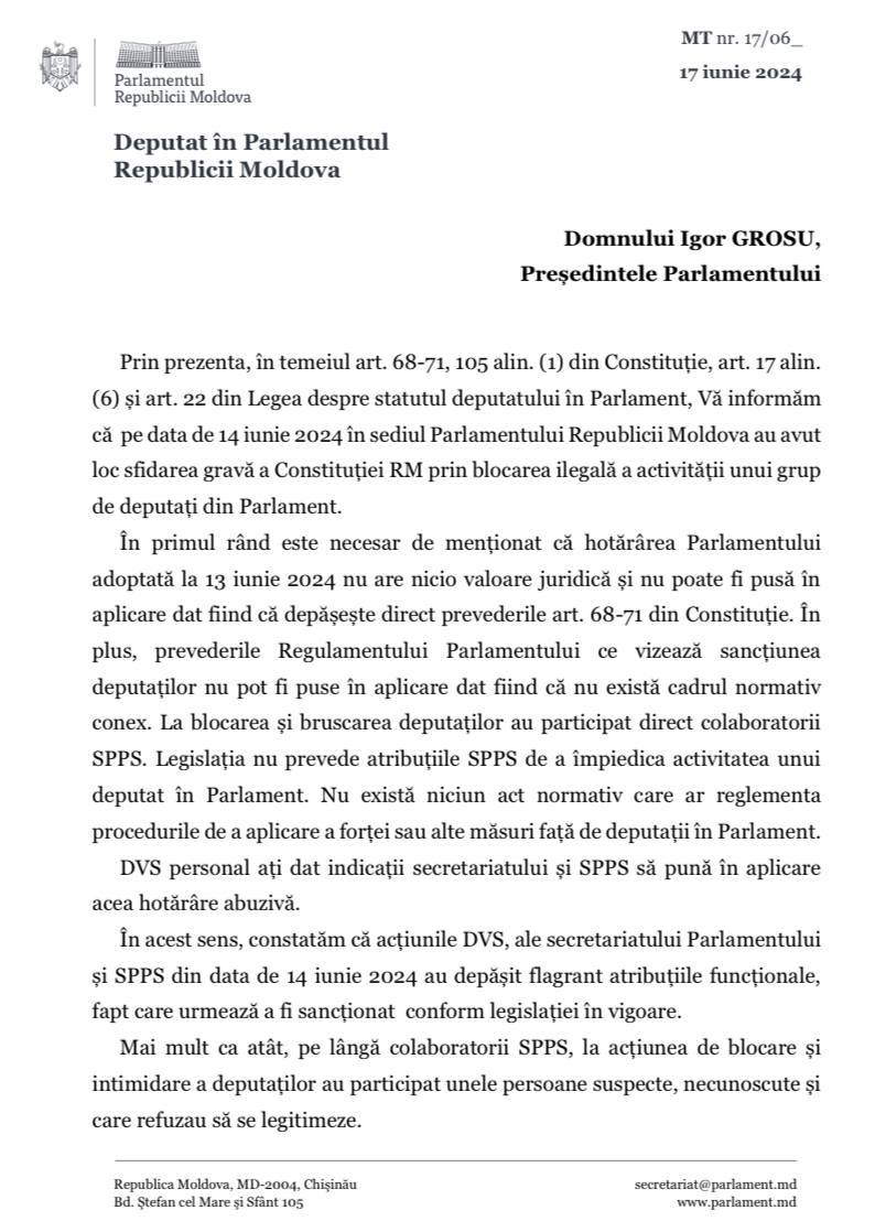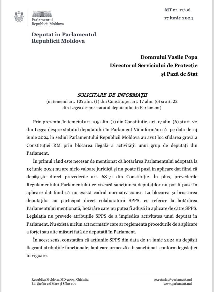 Deputații blocului „Victorie”, care au fost suspendați ilegal de la ședințele Parlamentului, au solicitat explicații cu privire la elucidarea situației. Destinatarii — speakerul Igor Grosu, șeful SIS, Alexandru Musteață, și directorul Serviciului Protecție și Pază de Stat, Vasile Popa.