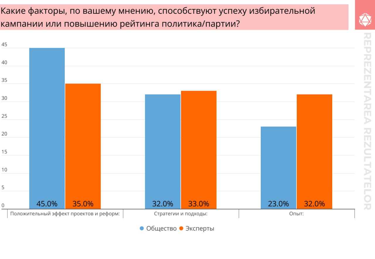 Rezultatele cercetării lunare „Political Rating”, realizată de Intellect Group, dezvăluie că factorii care contribuie cel mai mult la succesul unei campanii electorale sau la creșterea ratingului unui politician sau partid sunt proiectele și reformele cu impact concret în societate. Societatea acordă o importanță deosebită rezultatelor palpabile și proiectelor care îmbunătățesc calitatea vieții, în timp ce experții subliniază necesitatea schimbărilor strategice și sistemice, cu un procent de 35%.