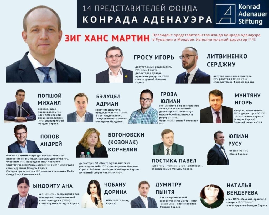 Deputatul PSRM a oferit detalii și despre activitatea Fundației Konrad Adenauer, care este unul dintre finanțatorii de bază a PAS, iar membrii acestei organizații sunt aceleași persoane: Igor Grosu, Dumitru Alaiba, Sergiu Litvinenco, Mihai Popșoi.