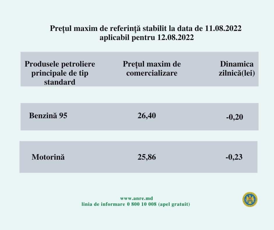 Prețurile pentru un litru de motorină și benzină scad din nou. Agenția Națională pentru Reglementare în Energetică (ANRE) anunță noile prețuri la carburanți pentru vineri, 12 august.