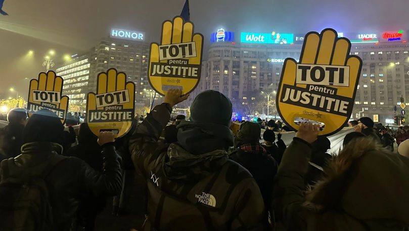 La București s‑a desfășurat pentru a șasea seară consecutivă un protest în Piața Victoriei, manifestanții cerând reforma sistemului de justiție și schimbări legislative urgente.