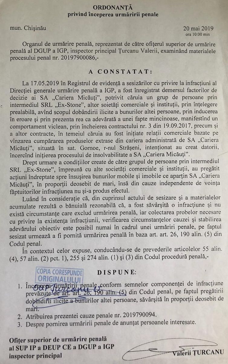 Curtea de Apel a emis această hotărâre, în pofida Ordonanței Direcției Generale Urmărire Penală a IGP al MAI privind începerea urmării penale pe faptul pregătirii dobândirii ilicite a bunurilor Carierei Micăuți prin intermediul „Ex-Stone” SRL, utilizând în acest sens inclusiv procedura de insolvență a „Ex-Stone” SRL”.