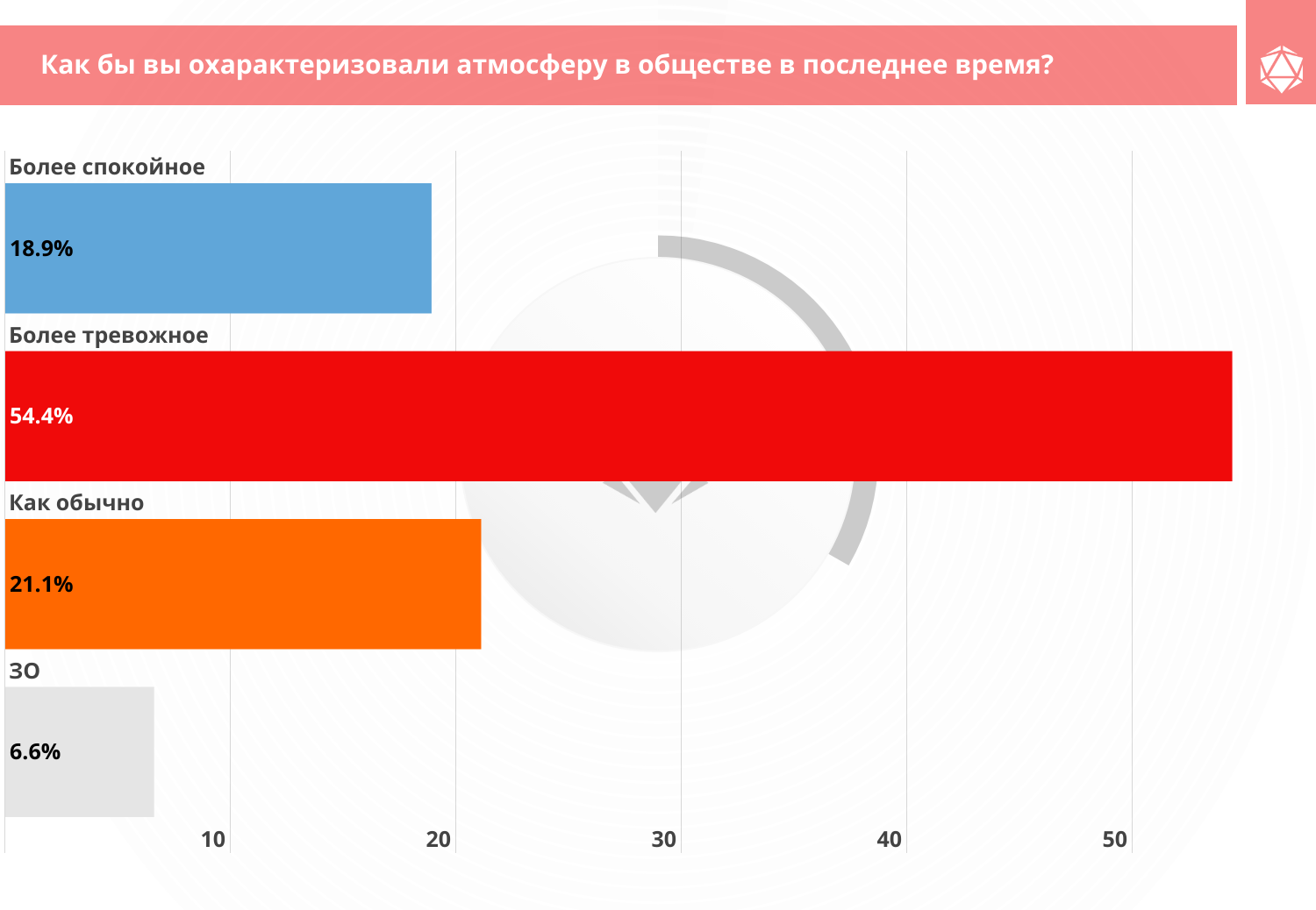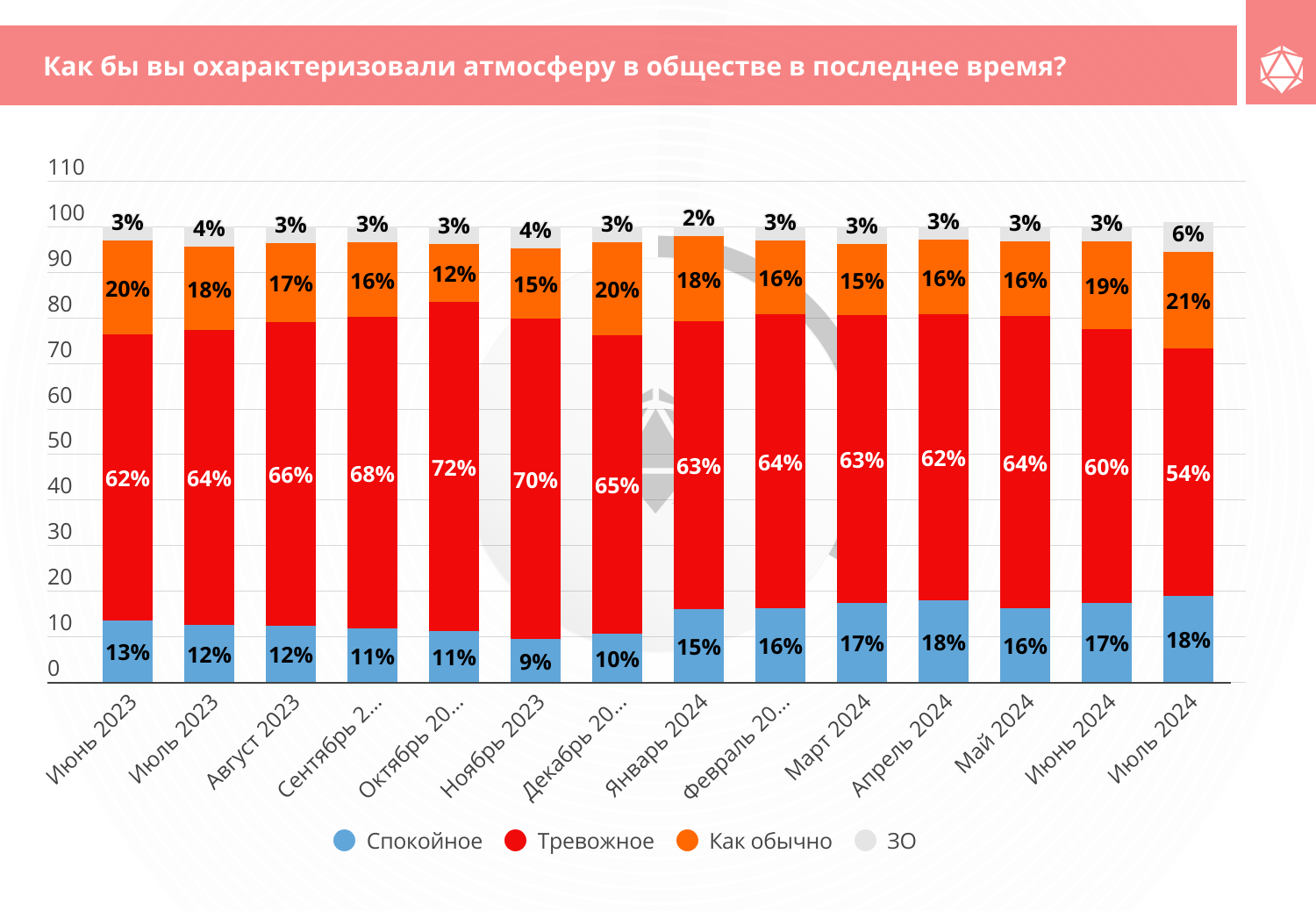 Începând din ianuarie 2024, s-a observat o creștere a numărului de persoane care consideră situația actuală ca fiind calmă. Această tendință sugerează că populația se obișnuiește cu stresul continuu, adaptându-se treptat la condițiile stresante din societate. Cu toate acestea, nivelul ridicat de anxietate rămâne o constantă în percepția generală a societății, reflectând preocupările cetățenilor în fața incertitudinilor zilnice.