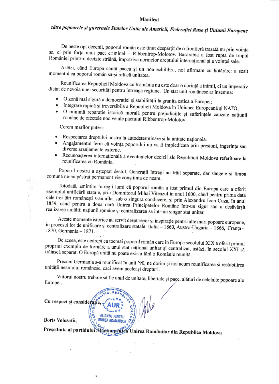 Potrivit unui comunicat de presă, liderul AUR Moldova, Boris Volosatîi, a citit în cadrul evenimentului un Manifest în care a denunțat granița impusă de pactul Ribbentrop-Molotov între Republica Moldova și România, cerând respectarea dreptului poporului român la unitate națională.