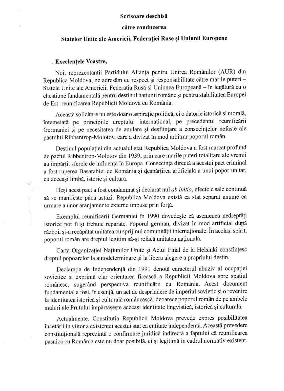 În scrisorile depuse la ambasade, AUR Moldova a subliniat că „reunificarea Republicii Moldova cu România nu este doar o aspirație politică, ci o datorie istorică și morală, fundamentată pe principiile dreptului internațional, pe precedentul reunificării Germaniei și pe necesitatea anulării consecințelor pactului Ribbentrop-Molotov”.