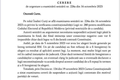 Grupul deputaților Partidului “ȘOR” s-au adresat Curții Constituțional, pe 24 octombrie 2023, solicitând urgentarea examinării...