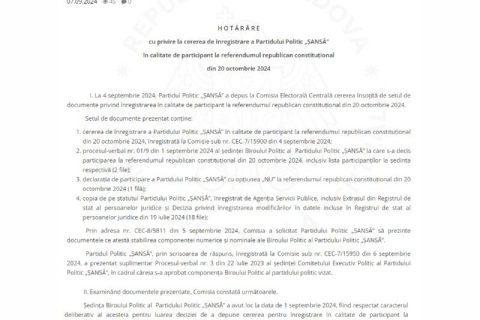 Astăzi, Comisia Electorală Centrală a Moldovei a decis să înregistreze partidul „Șansă” ca participant la...