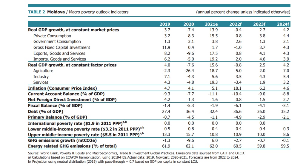 Estimările Băncii Mondiale arată că economia Moldovei va scădea în acest an cu 0,4%. Potrivit instituției, anul viitor Moldova va înregistra o creștere de doar 2,7%, iar în 2024 se prognozează 4,2%.