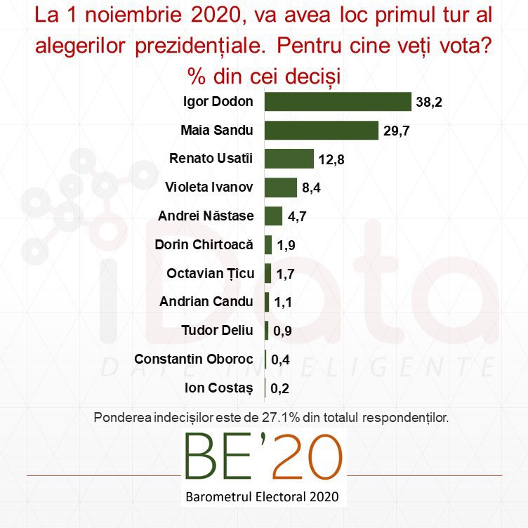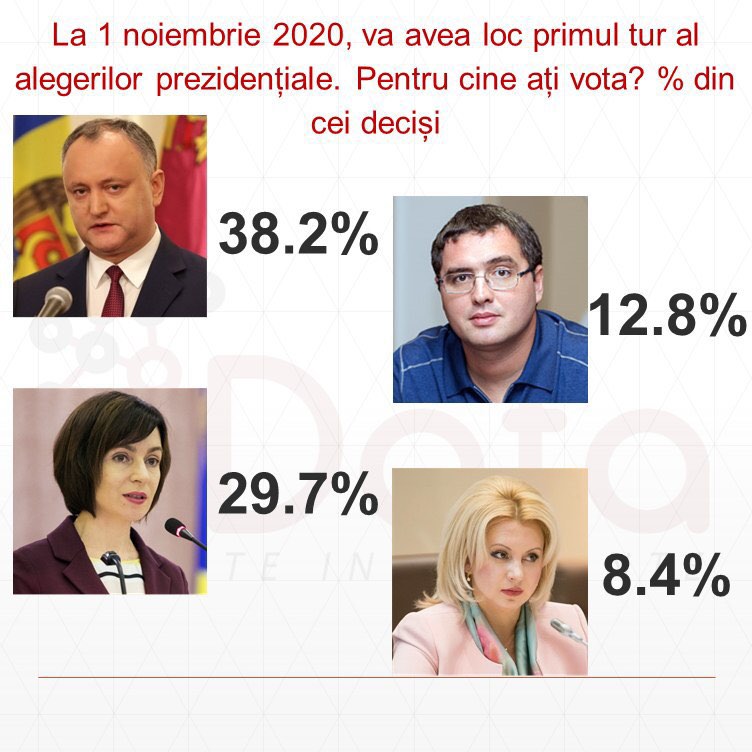 Igor Dodon rămâne lider în sondajele despre cursa prezidențială. Potrivit Barometrului Electoral 2020, ediția din septembrie, care a fost realizat de compania IData, la alegerile prezidențiale din 1 noiembrie 2020, pentru actualul președinte sunt gata să-și dea votul 38,2% din cetățenii deciși. Pe locul doi s-a clasat Maia Sandu cu 29,7%, iar pe locul trei – Renato Usatîi, pentru care ar vota 12,8%. Candidatul PP „Șor”, Violeta Ivanov, ar obține 8,4 la sută din voturi, iar liderul PPDA Andrei Năstase – 4,7%. Ceilalți candidați ar acumula sub 2% din voturi. Ponderea indecișilor este de 27,1% din totalul respondenților.