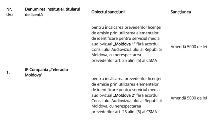 Consiliul Audiovizualului (CA) anunță vineri, 18 noiembrie, că a sancționat furnizorul public de servicii media audiovizuale IP Compania „Teleradio-Moldova” cu două amenzi de 5.000 de lei pentru încălcarea prevederilor licenței de emisie prin utilizarea elementelor de identificare (semnelor grafice) noi fără acordul CA.