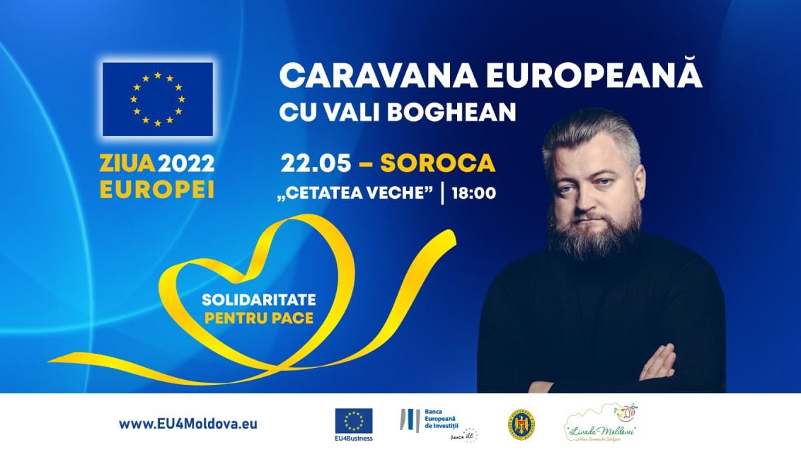 După sărbătoarea organizată la Ungheni, Caravana Europeană a pornit de la Prut spre Nistru. Duminică, 22 mai, oprim la Soroca, împreună cu Vali Boghean Band.La Cetatea Sorocii va fi organizat un târg al produselor autohtone: legume, fructe proaspete și uscate, vinuri și levănțică. Organizatorii vor prezenta proiecte de success în agricultură, implementate de beneficiarii programului  „Livada Moldovei”, precum și  oportunitățile de finanțare din partea Uniunii Europene și a Băncii Europene de Investiții.Caravana Europeană, dedicată Zilelor Europei în Republica Moldova, se vrea un eveniment pentru vizitatorii de toate vârstele. Avem grijă și de cei mai mici, organizând pentru copii mai multe activități. Ziua va culmina cu un concert live, marca Vali Boghean Band și proiecție de lumini pe cetatea Sorocii.La eveniment va participa ministrul Agriculturii, Viorel Gherciu, șeful reprezentanței Băncii Europene de Investiții în Republica Moldova, Alberto Carlei, precum și autorități locale.Dăm startul sărbătorii la ora 18.00 cu prezentarea proiectelor de succes, continuăm cu discuții informale, ca la ora 20.00 să fim gata pentru concertul lui Vali Boghean. Caravana Europeană se va încheia la ora 21.00 cu un show de lumini pe Cetatea Sorocii.Caravana Europeană va ajunge și la Ștefan Vodă, pe 5 iunie.„Livada Moldovei” este o linie de credit de 120 de milioane de euro, care sprijină activitățile întregului lanț valoric horticol, de la producere și procesare până la ambalare și comercializare. Programul este finanțat de Uniunea Europeană prin intermediul Băncii Europene de Investiții.