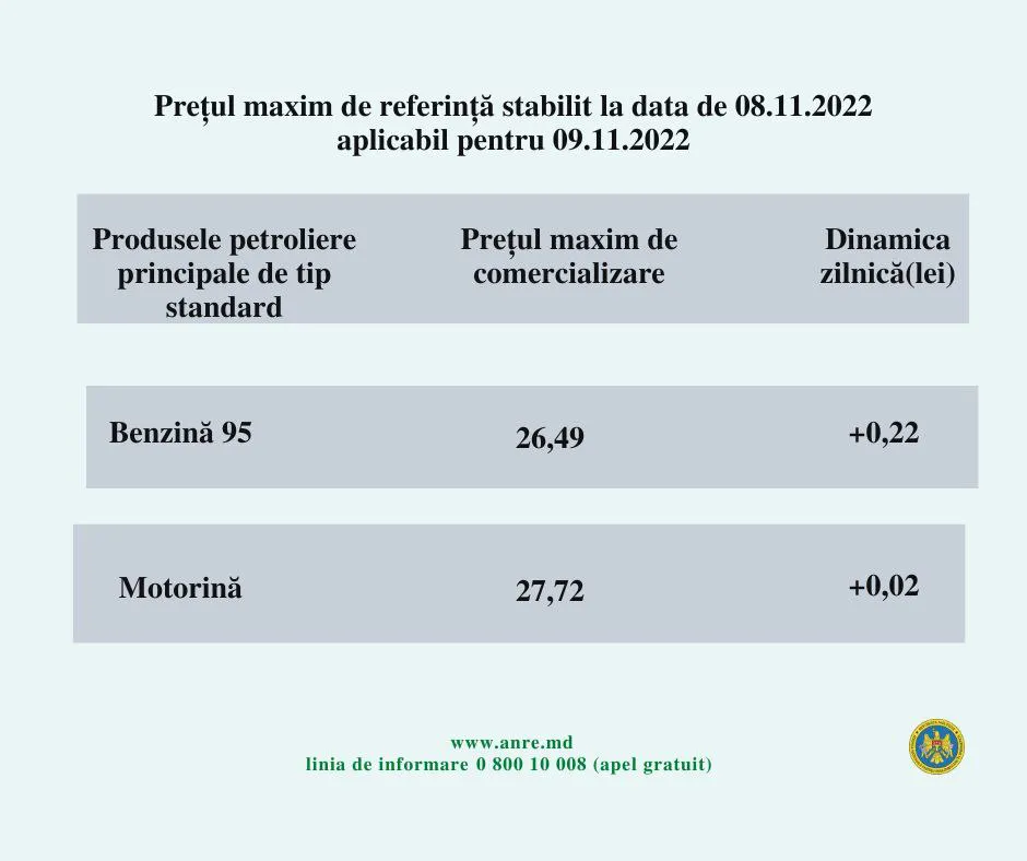Astfel, prețul pentru un litru de benzină A95 nu trebuie să depășească 26,49 lei, iar cel pentru motorină – 27,72 lei.