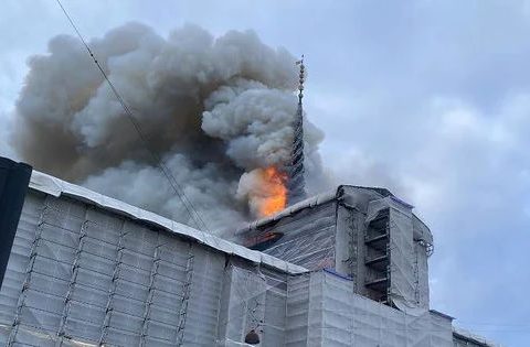 Incendiu puternic la Copenhaga: Vechea turlă a Bursei de Valori se prăbușește