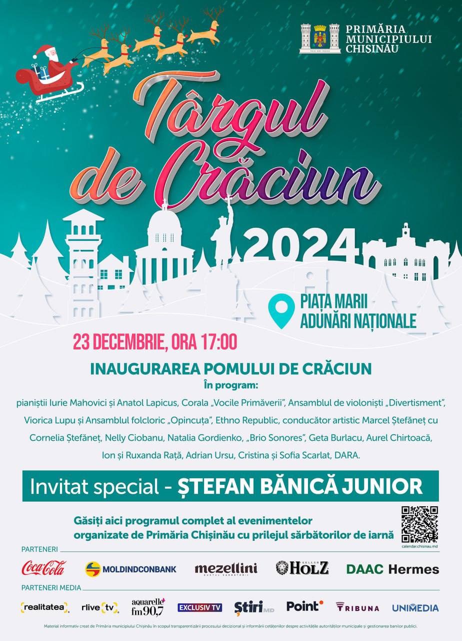 Amintim, în data de 23 decembrie, Primăria Chişinău invită locuitorii și oaspeții orașului la festivitatea de aprindere a luminiţelor de pe principalul brad al ţării şi inaugurarea Târgului de Crăciun în Piața Marii Adunări Naționale.