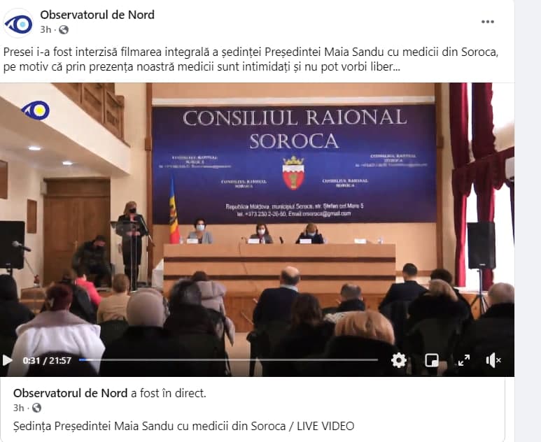 “Presei i-a fost interzisă filmarea integrală a ședinței Președintei Maia Sandu cu medicii din Soroca, pe motiv că prin prezența noastră medicii sunt intimidați și nu pot vorbi liber…”, scrie Observatorul de Nord.