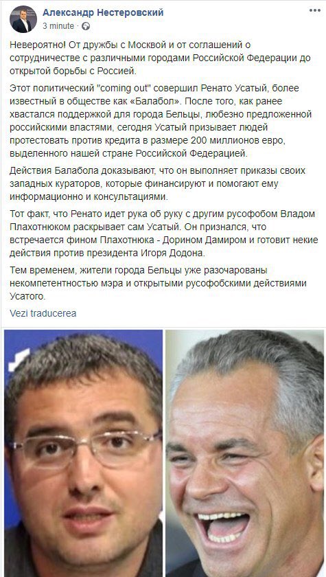 După ce s-a lăudat anterior cu diferit suport pentru Bălți, oferit cu drag de autorități ruse, acum Usatîi cheamă oamenii să protesteze împotriva ajutorului de 200 de milioane de euro oferit țării noastre de către Federația Rusă. Acțiunile Balabolului trădează faptul că acesta îndeplinește comenzile curatorilor lui din vest, care-l finanțează și-l ajută cu diferite informații și consultații. Activitatea Balabolului mână în mână cu alt rusofob, Vlad Plahotniuc, este dată pe față chiar de către Usatîi, care a recunoscut că se întâlnește și pune la cale acțiuni împotriva președintelui Igor Dodon împreună cu finul lui Plahotniuc, Dorin Damir. Cetățenii din municipiul Bălți sunt din ce în ce mai dezamăgiți atât de managementul prost al localității, dar și de acțiunile rusofobe deschise ale primarului Usatîi.
