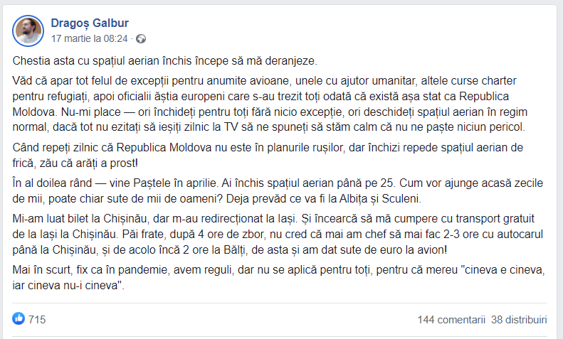 „Vine Paștele, în aprilie. Ai închis spațiul aerian până pe 25. Cum vor ajunge acasă zecile de mii, poate chiar sute de mii de oameni? Deja prevăd ce va fi la Albița și Sculeni. Mi-am luat bilet la Chișinău, dar m-au redirecționat la Iași. Și încearcă să mă cumpere cu transport gratuit de la Iași la Chișinău. Păi frate, după patru ore de zbor, nu cred că mai am chef să mai fac 2-3 ore cu autocarul până la Chișinău, și de acolo încă 2 ore la Bălți, de asta și am dat sute de euro la avion! Mai pe scurt, fix ca în pandemie, avem reguli, dar nu se aplică pentru toți, pentru că mereu „cineva e cineva, iar cineva nu-i cineva”, a mai scris Dragoș Galbur.
