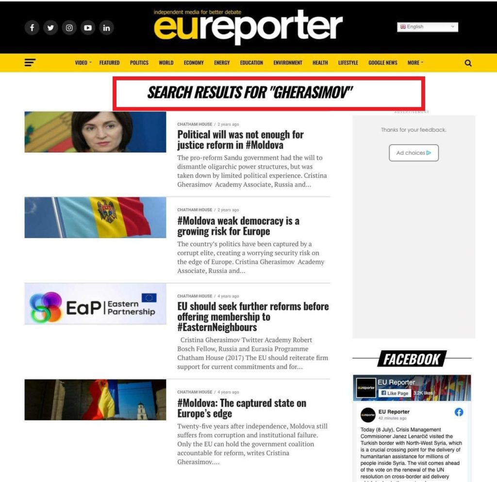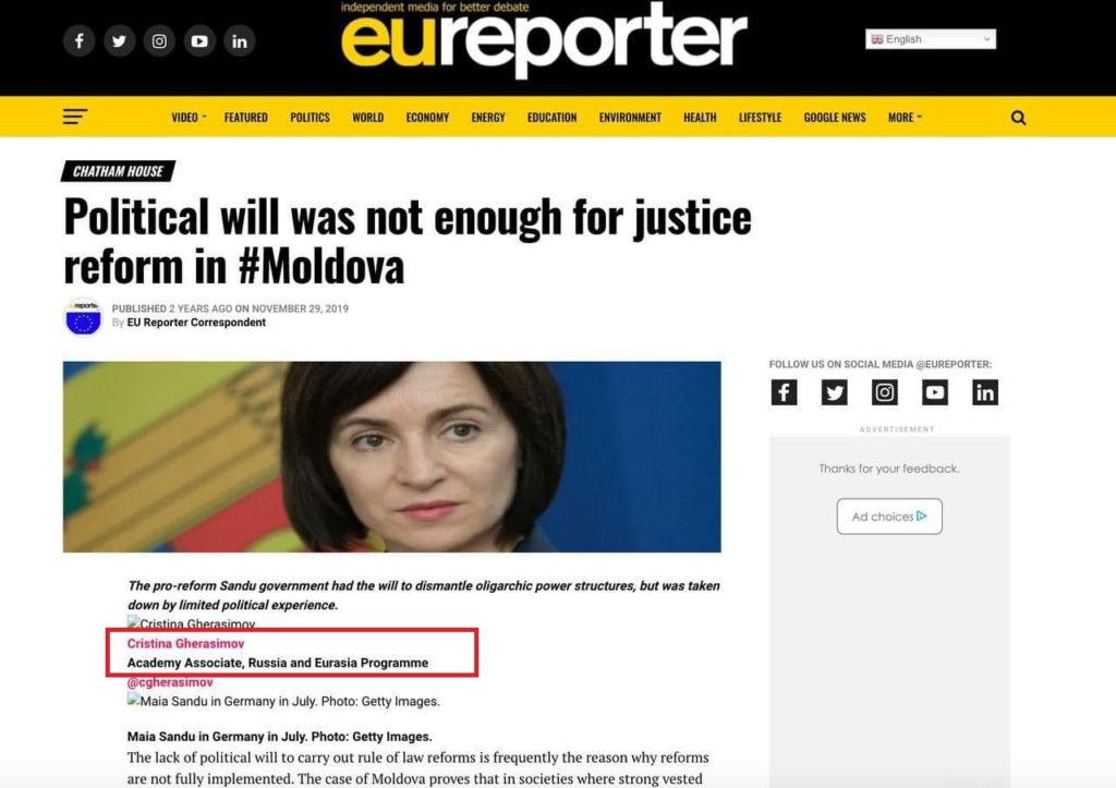 Cristina Gherasim, consiliera Maiei Sandu în domeniul politicii externe, a fost angajată la portalul de știri EUREPORTER.CO, cel care a publicat un fals vădit despre o presupusă finanțare a Blocului Comuniștilor și Socialiștilor. Despre aceasta aflăm chiar de pe site-ul în cauză.