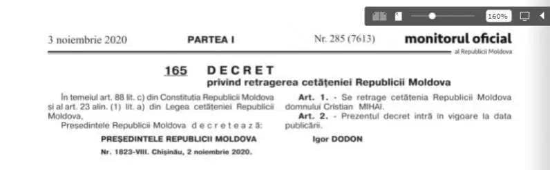 Decretul președintelui Igor Dodon prin care i-a fost retrasă cetățenia Republicii Moldova oferită fostului deputat român, Cristian Rizea, a fost publicat în Monitorul Oficial.