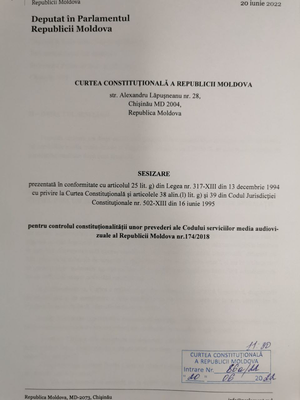 Deputații PSRM, Adela Răileanu și Grigore Novac au depus o sesizare la Curtea Constituțională prin care au solicitat Înaltei Curți să se expună pe marginea constituționalității unor articole din Legea nr.143 pentru modificarea Codului serviciilor media audiovizuale, adoptată recent și numită generic în societate „legea cenzurii”.