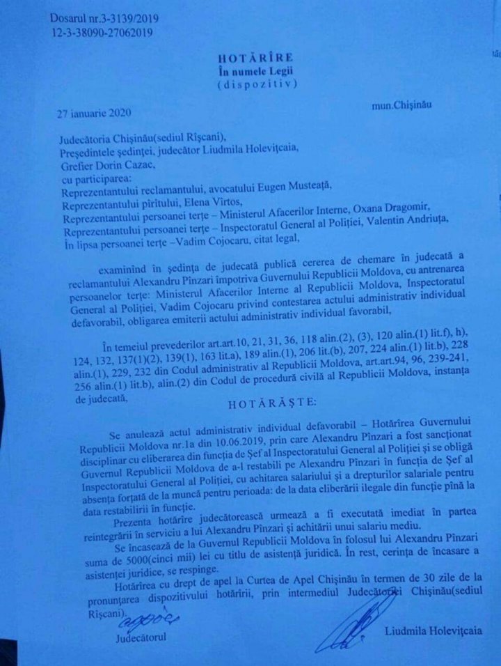 Prin decizie, Guvernul este obligat să-l restabilească pe Alexandru Pînzari în funcția de șef al Inspectoratului General al Poliției cu achitarea salariului și a drepturilor salariale pentru absența forțată de la muncă.