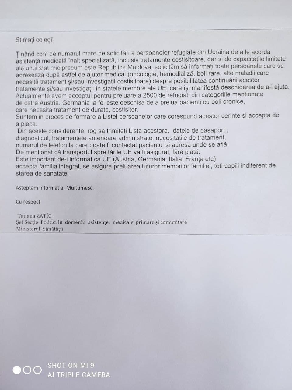 În scrisoare mai este menționat faptul, că în prezent, țara noastră a obținut acordul pentru transportarea a 2500 de pacienți în Austria, dar și Germania este gata să îi primească. Transportarea cetățenilor în clinicile din UE se va face gratuit.