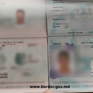 În bagajele a doi cetățeni ai Israelului, polițiștii de frontieră au depistat pașapoarte turcești cu semne clare de falsificare. Mai mult că pașapoartele nu aparțineau cetățenilor prezenți la linia de control. Pentru formalitățile de trecere a frontierei de stat, străinii s-au prezentat printre pasagerii sosiți în Moldova cu ruta „Istanbul-Chișinău”. În circumstanțele stabilite, intrarea în R. Moldova pentru acești doi israelieni a fost refuzată, cu următoarea cursă – returnați în țara de pornire. Cercetările pe caz continuă.