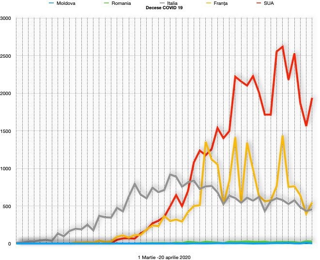 Astfel, economistul Roman Chirca a comparat numărul de decese, provocate de COVID-19 în Republica și România cu alte țări, precum Italia, SUA și Franța. Din imagine vedem că situația în țara noastră este stabilă, comparativ cu celelalte state, unde numărul de decese crește dramatic de la o zi la alta.