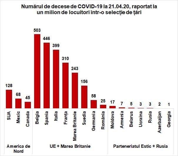 “Stăm mai bine ca România, dar nu departe. La noi e mai bine decât în majoritatea țărilor UE, dar mai rău ca-n Parteneriatul Estic, unde.. ciudat, parcă nici nu e COVID-19, dar pur și simplu mai mor oamenii de gripă sau de altceva. Deși în SUA sunt cele mai multe decese înregistrat la moment, totuși, raportat la numărul populației, situația la ei nu e la fel de rea ca-n Belgia, de exemplu, unde la 1 milion de persoane au decedat deja de 4 ori mai mulți oameni decât în SUA”, menționează expertul IData.