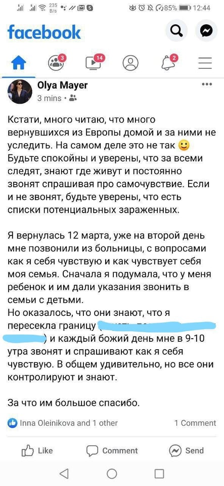 „Am revenit în data de 12 martie, iar a doua zi deja m-au sunat din spital și m-au întrebat cum mă simt eu și familia mea”, scrie Olya Mayer.