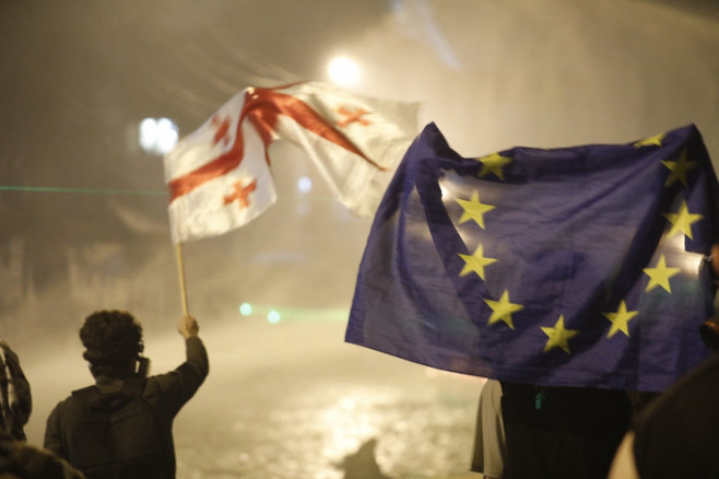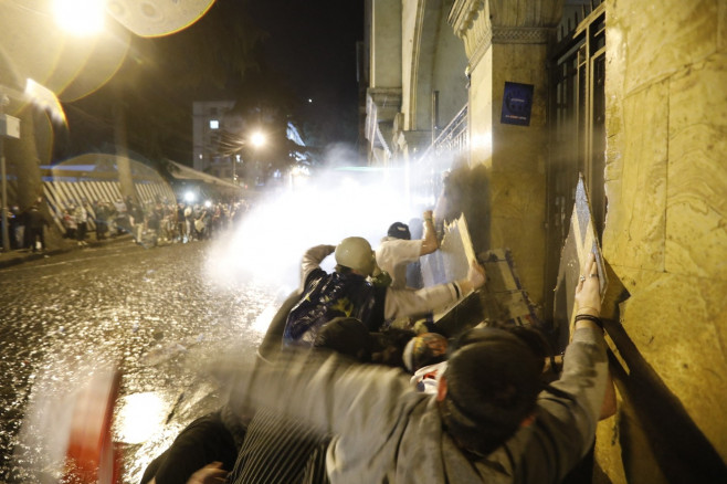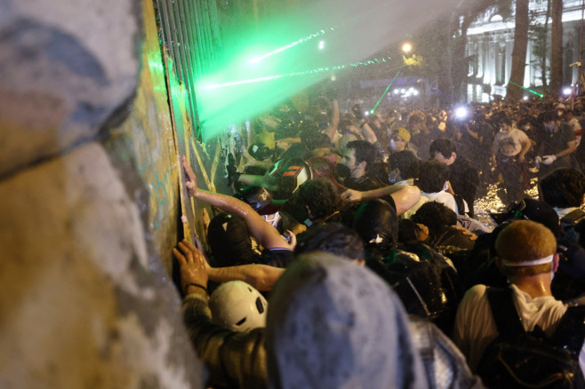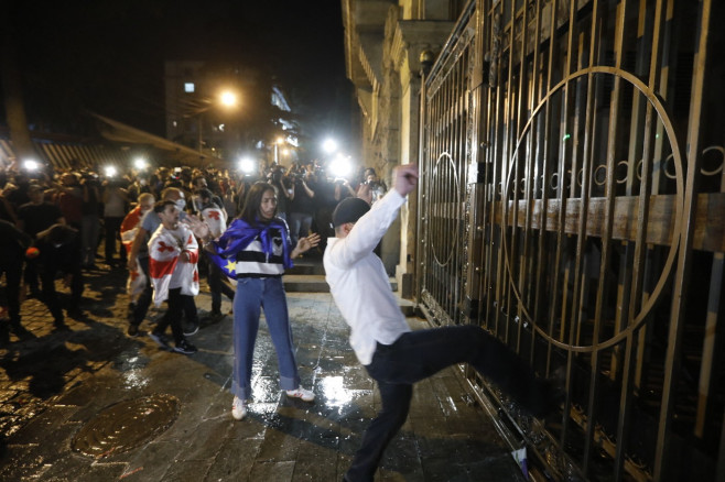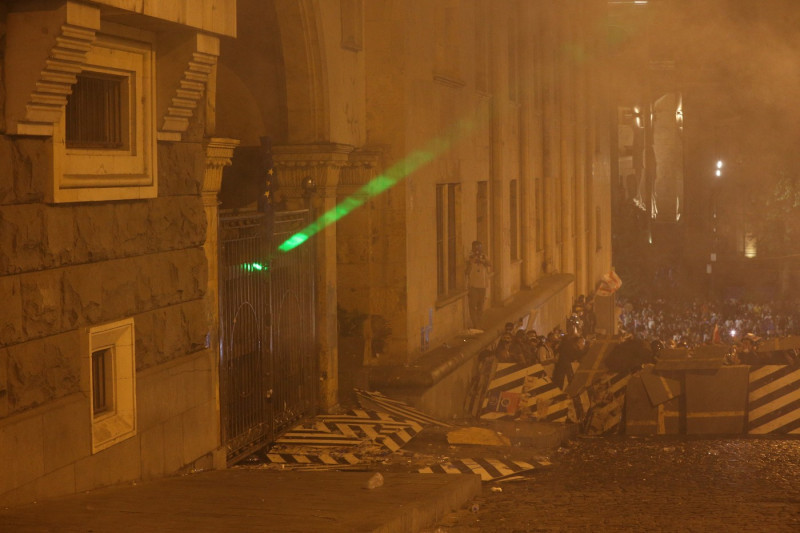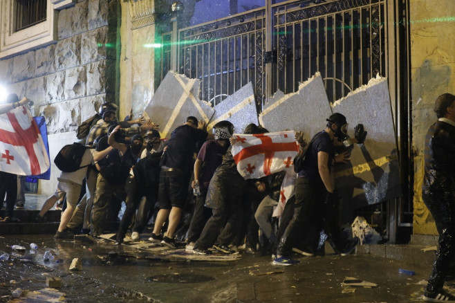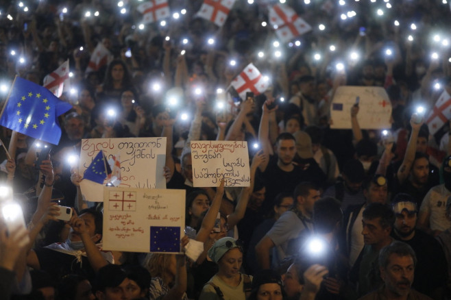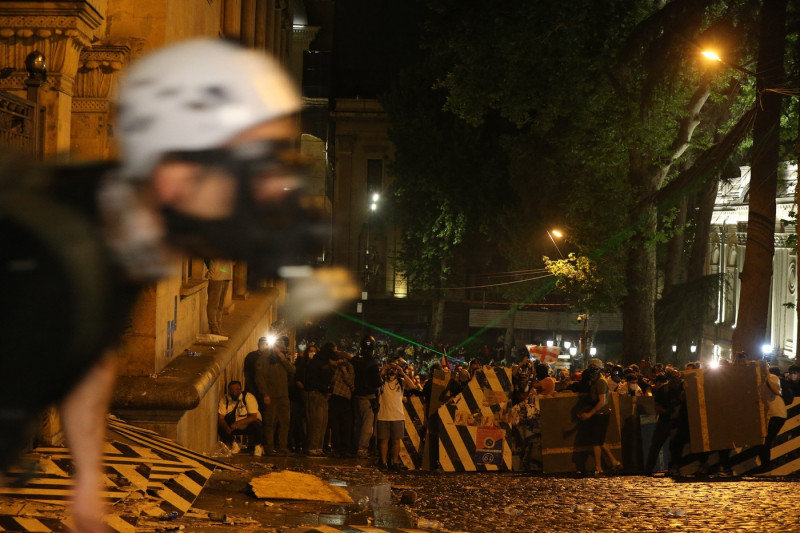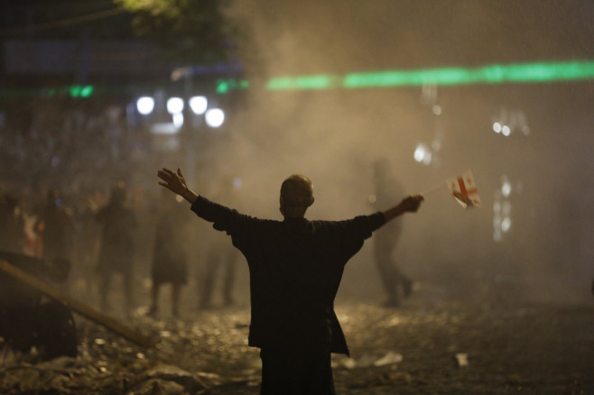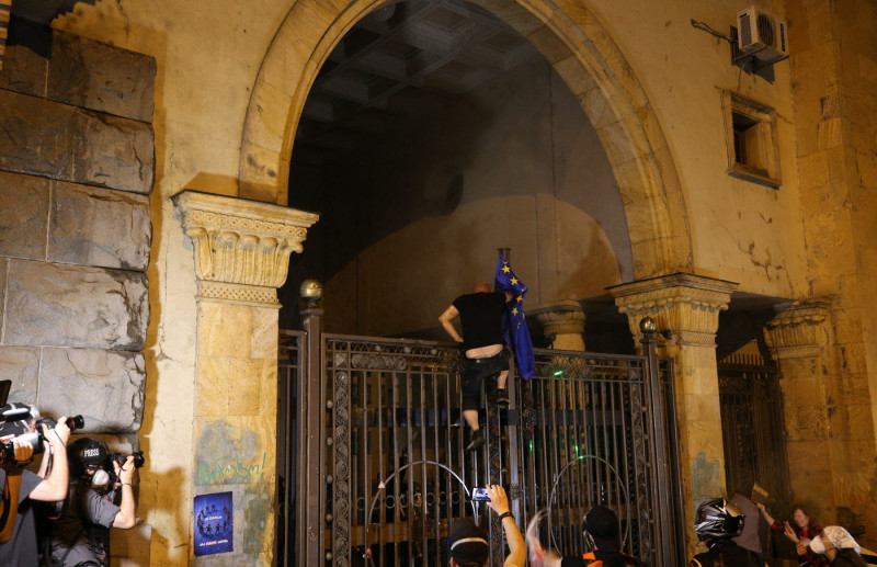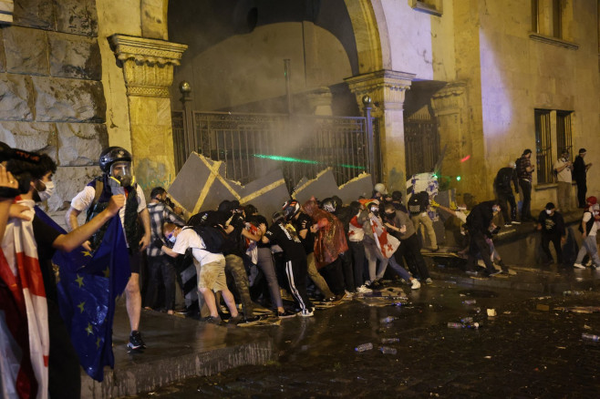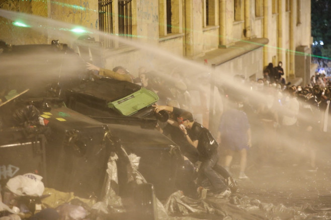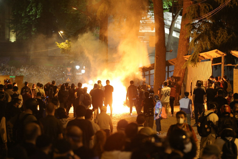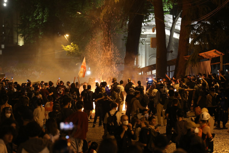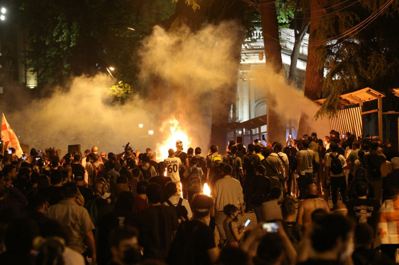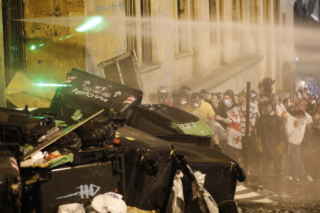 Mii de oameni fluturând steaguri ale Georgiei și ale Uniunii Europene s-au adunat în fața parlamentului. De aproape o lună, oamenii ies cu zecile de mii, la demonstrații tot mai mari, iar cea de aseară a fost cea mai mare de până acum. Protestatarii au ridicat baricade și au dat foc, în timp ce polițiștii au folosit tunurile cu apă.