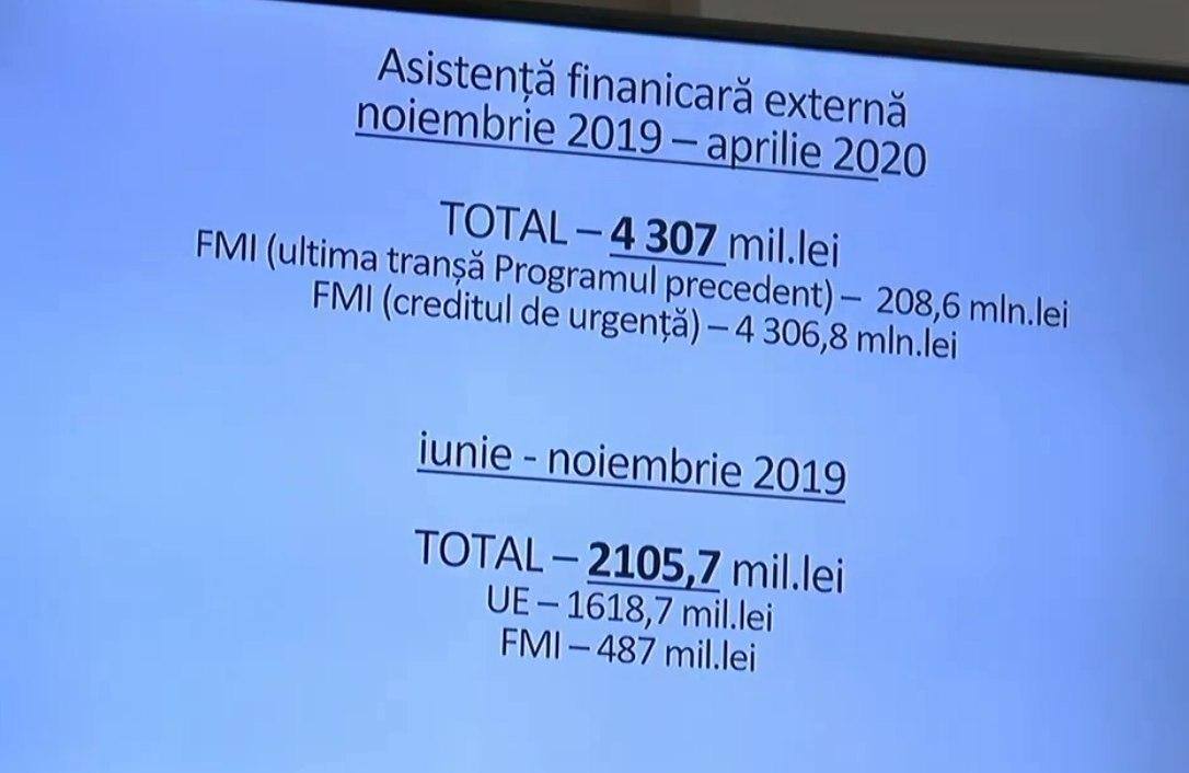 Astfel, în perioada noiembrie 2019 – aprilie 2020, Moldova a atras 4,3 miliarde de lei. Este vorba despre ultima tranșă din programul de finanțare cu Fondul Monetar Internațional, dar și creditul de urgență acordat de FMI.