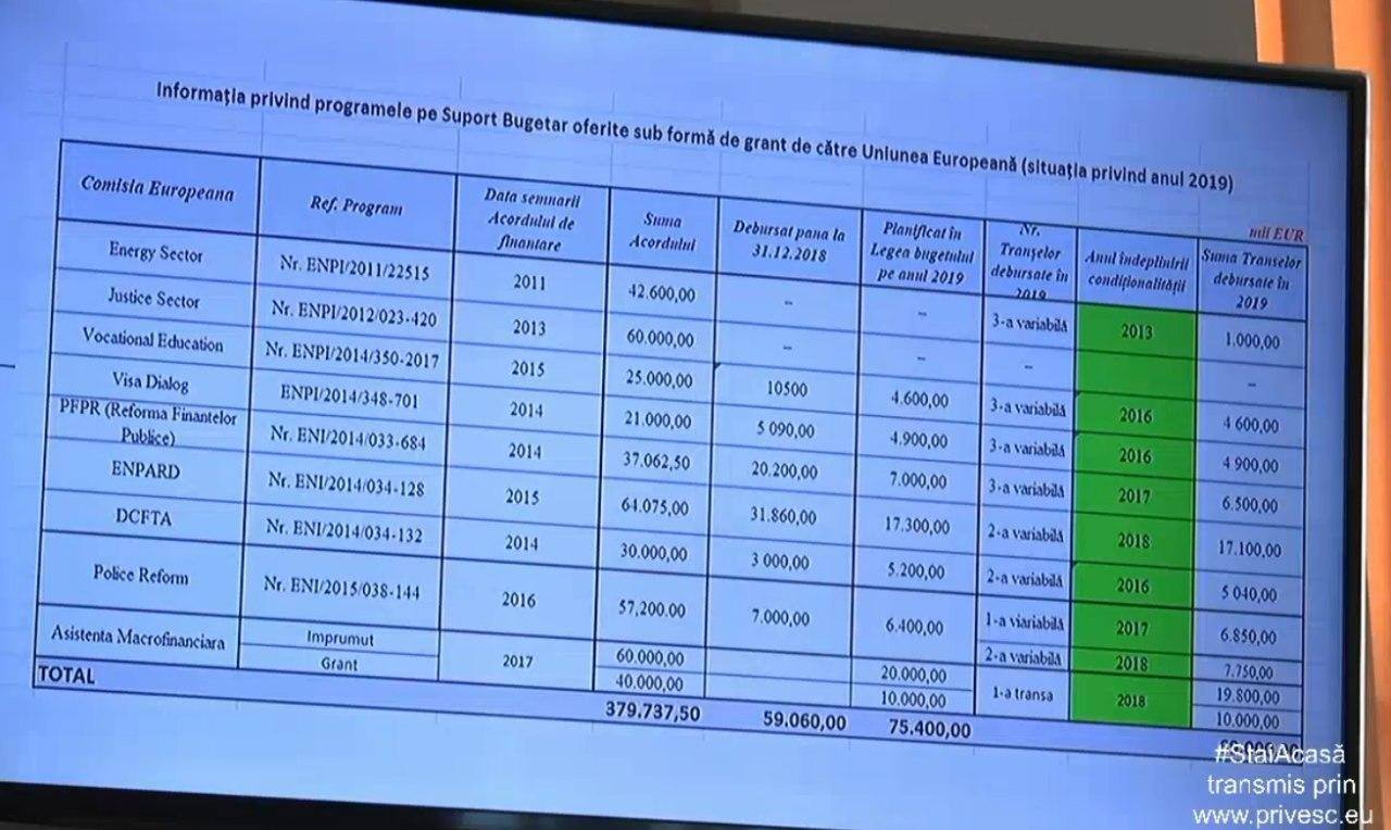 Totodată, în perioada iunie – noiembrie 2019, în Moldova au venit 2,1 miliarde lei din asistență externă. Este vorba despre banii de la UE și FMI. Premierul a explicat că banii veniți din UE se datorează activității guvernelor precedente, care au activat până în 2019.