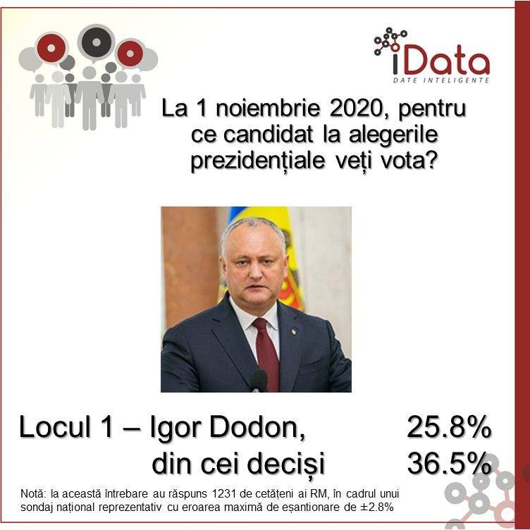 Respondenții au fost întrebați pentru cine vor vota în data de 1 noiembrie 2020. Majoritatea, 36,5 la sută din cetățenii deciși, au spus că își vor da votul pentru Igor Dodon. Pe locul doi s-a clasat Maia Sandu cu 30%, iar pe locul trei este Renato Usatîi, pentru care sunt gata să voteze doar 14 la sută din cetățenii deciși.