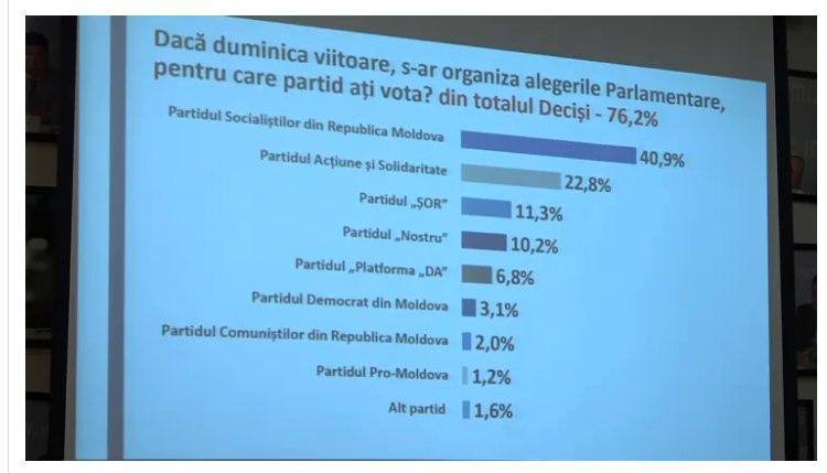 Potrivit studiului, pentru PSRM și-ar da votul aproape 41% din cetățeni deciși, pe locul doi s-a clasat PAS cu 22,8%, iar pe locul trei PP „ȘOR” – 11,3%. În caz de anticipate, în parlament ar mai accede formațiunea politică „Partidul Nostru”, pentru care ar vota puțin peste 10 la sută din cetățeni și Platforma DA cu 6,8% din voturi.