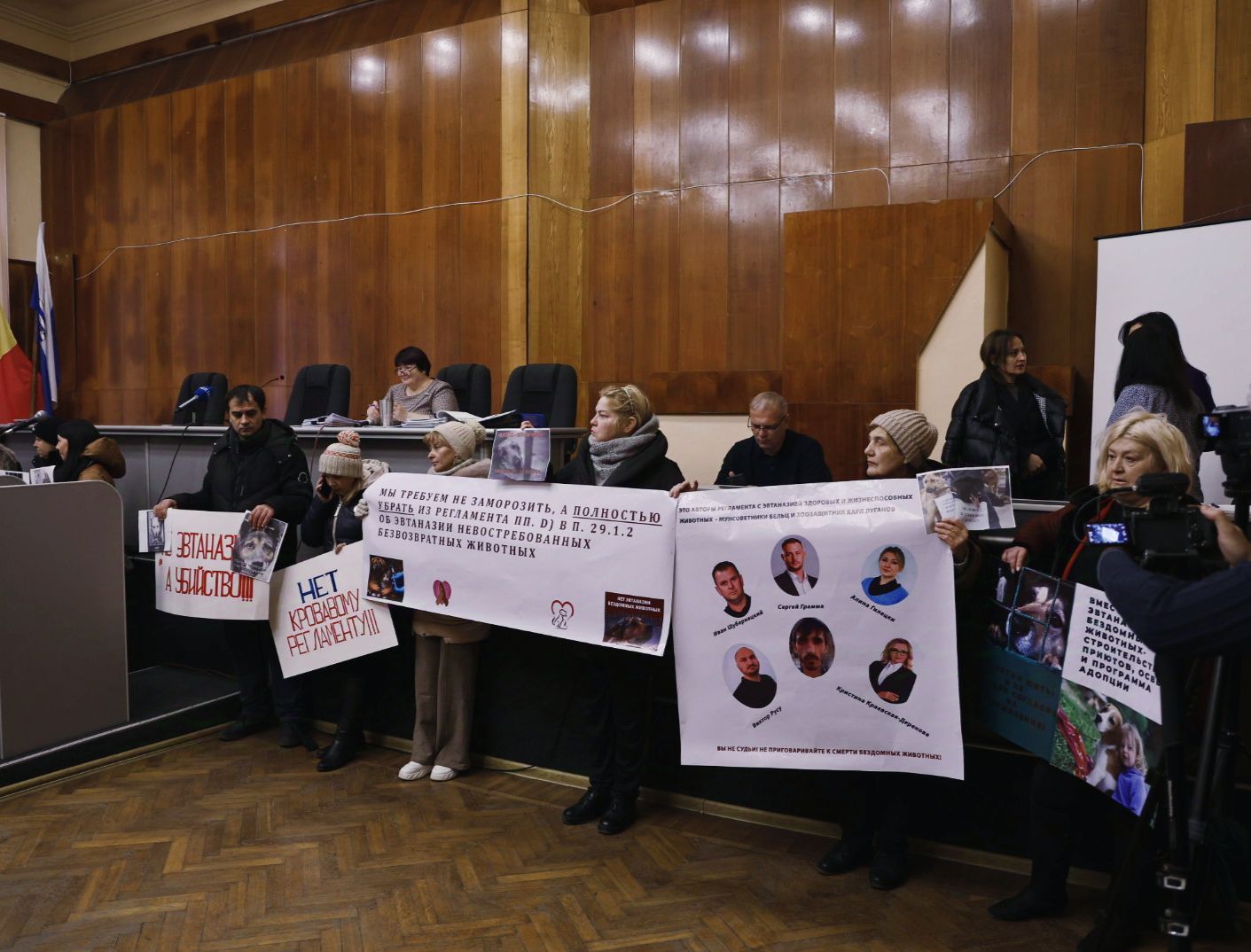 Aceștia țineau în mâini pancarte cu inscripții: „Nu regulamentelor sângeroase!”, „Suntem împotriva eutanaziei animalelor!”, „Cerem nu înghețarea, dar excluderea definitivă a punctului care prevede eutanazia!”