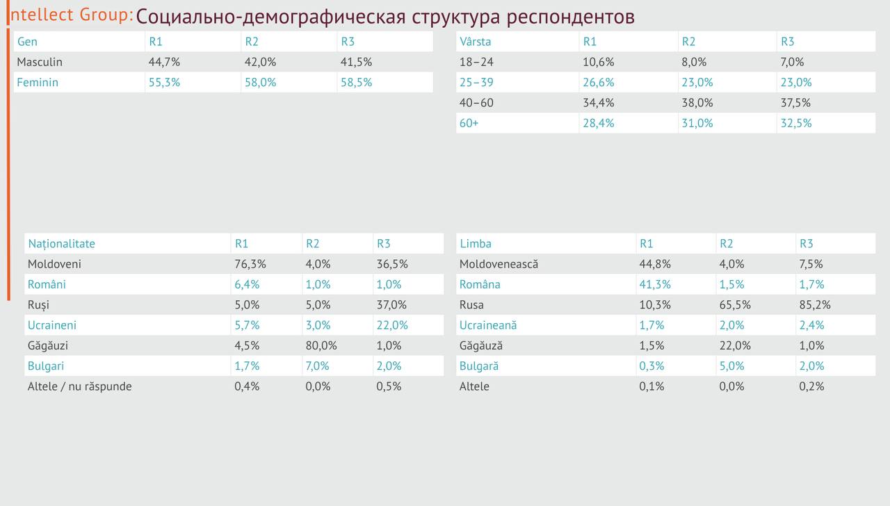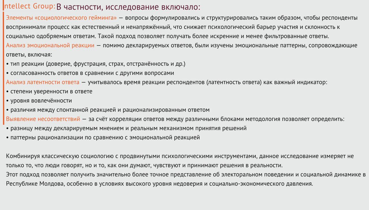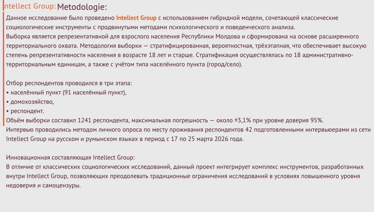 Cercetarea a fost realizată de Intellect Group în perioada 17–25 martie 2026, pe un eșantion de 1.241 de respondenți din 91 de localități. Marja de eroare este de ±3,1%, iar datele au fost colectate prin interviuri față în față (F2F), în limbile română și rusă, utilizând un model extins de analiză care include măsurarea reacțiilor și evaluarea emoțională a respondenților.