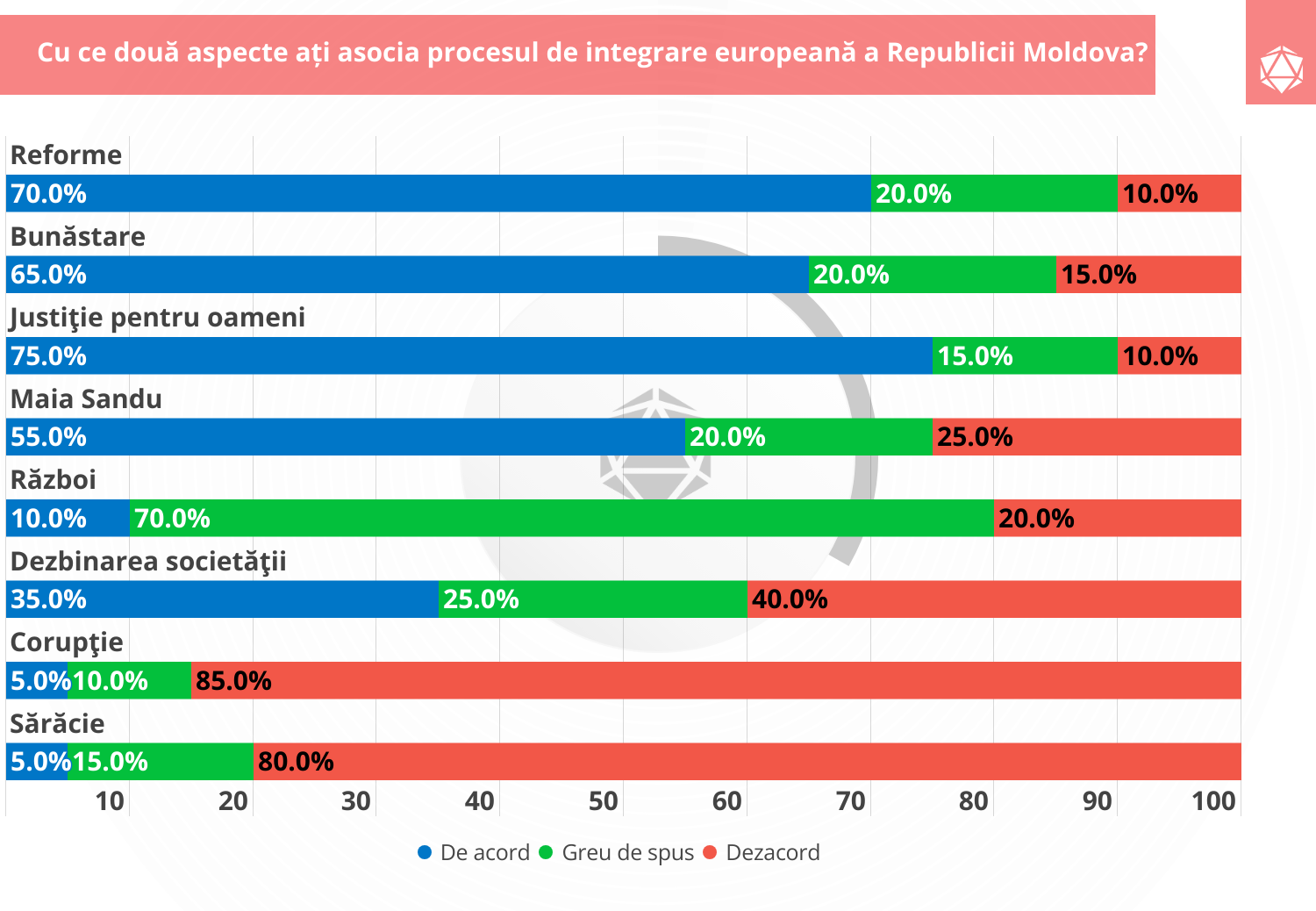 Un recent sondaj realizat de compania “Intellect Group” arată că moldovenii asociază integrarea europeană cu concepte precum justiția, reformele și prosperitatea. Conform rezultatelor, 75% dintre respondenți consideră justiția drept un aspect central al integrării europene, în timp ce reformele și prosperitatea sunt menționate de 70%, respectiv 65% dintre participanți.