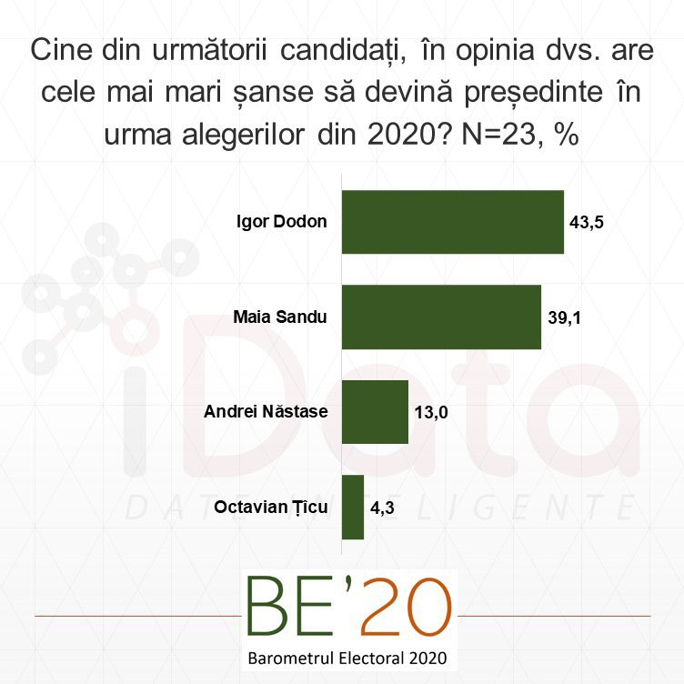 Astfel, experții, care au participat la sondaj, susțin că actualul șef al statului are 43,5% din șanse să câștige un al doilea mandat la Președinție, Maia Sandu – 39%, iar Andrei Năstase – 13%.