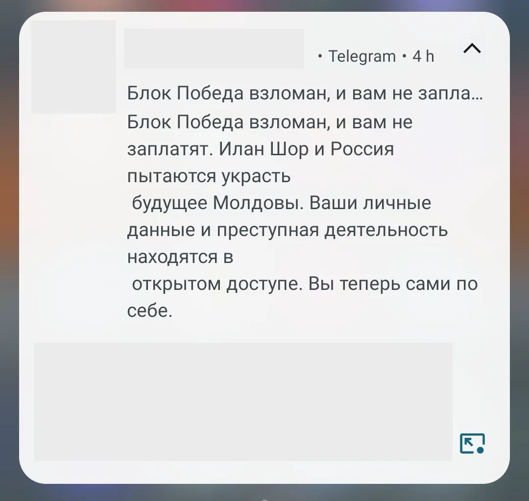 „Blocul „Victorie” a fost spart, iar voi nu veți fi plătiți. Ilan Șor și Rusia încearcă să fure viitorul Republicii Moldova. Datele voastre personale și activitatea infracțională sunt publice. Acum sunteți pe cont propriu”, se arată în mesajul publicat pe Telegram, transmite breakingnews.md cu referire la zdg.md.