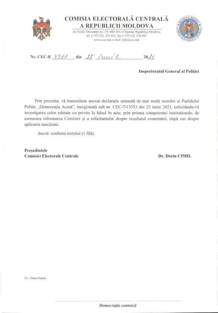 Dorin Cimil, numit în fruntea CEC cu suportul și la propunerea expresă a PAS, a transmis IGP-lui declarația semnată de mai mulți pretinși membri ai Partidului Politic ”Democrația Acasă”, înregistrat săptămâna trecută, solicitând în mod expres investigarea celor relatate cu privire la falsul în acte, prin prisma competenței instituționale. La plângerea înaintată IGP-lui nu au fost anexate și probe care să demonstreze că semnatarii plângerii sunt membri ai PP ”Democrația Acasă”.