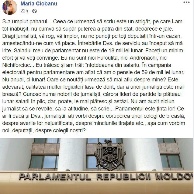 Dragi jurnaliști, vă rog, vă implor, nu ne puneți pe toți deputații într-un cazan, amestecându-ne cum vă place. Întrebările Dvs. de serviciu au început să mă irite. Salariul meu de parlamentar nu este de 18 mii lei lunar. Faceți un minim efort și vă veți convinge”, a scris Ciobanu pe Facebook.