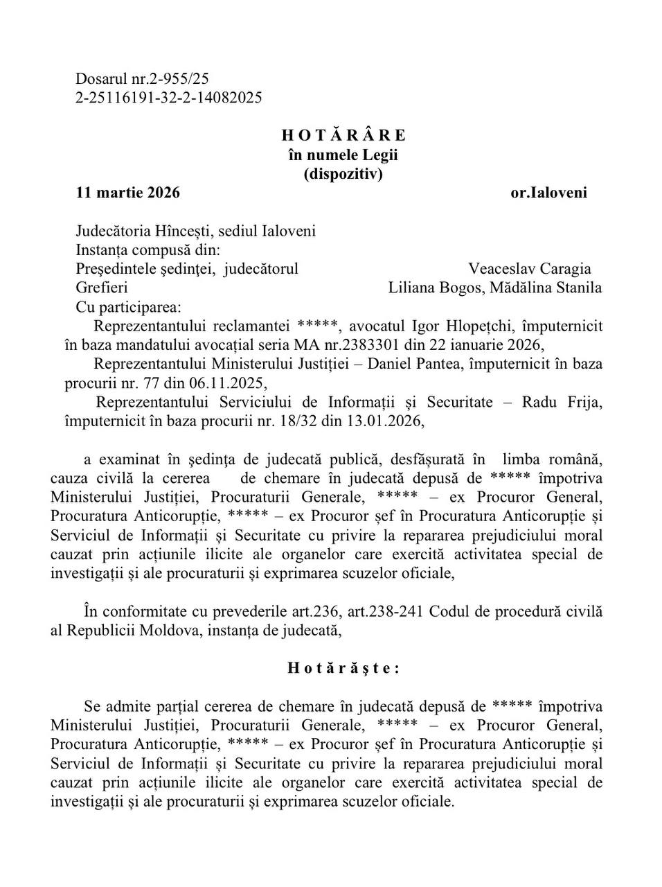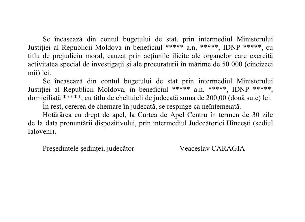 Magistrații sediului Ialoveni al Judecătoriei Hîncești au stabilit că prejudiciul moral a fost cauzat prin acțiunile organelor care exercită activitatea specială de investigații și ale procuraturii. În acest proces au fost vizate instituții-cheie, precum Procuratura Generală, Procuratura Anticorupție și Serviciul de Informații și Securitate (SIS).