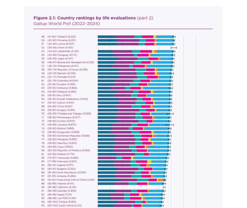 Moldova a coborât nouă poziții în clasamentul celor mai fericite țări din lume, ocupând locul 80 în World Happiness Report 2025. În comparație, România se află pe locul 35, iar pe primele locuri domină țările nordice: Finlanda, Danemarca, Islanda, Suedia și Țările de Jos. În partea de jos a clasamentului se află Zimbabwe, Liban și Afganistan.