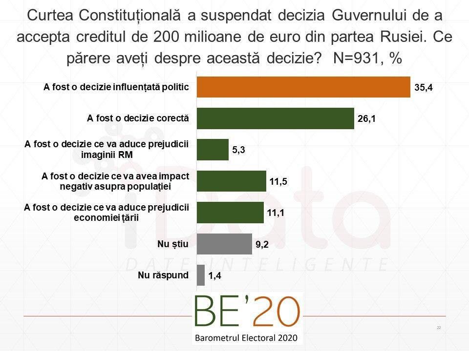 Totodată, 26,1 la sută din respondenți au spus că este corectă decizia magistraților de a suspenda împrumutul de 200 milioane de euro din partea Rusiei, iar 27,9 spun că aceasta va aduce prejudicii economiei, dar și imaginii Republicii Moldova și că va avea impact negativ asupra populației.