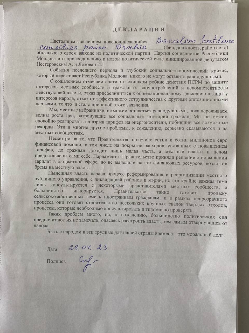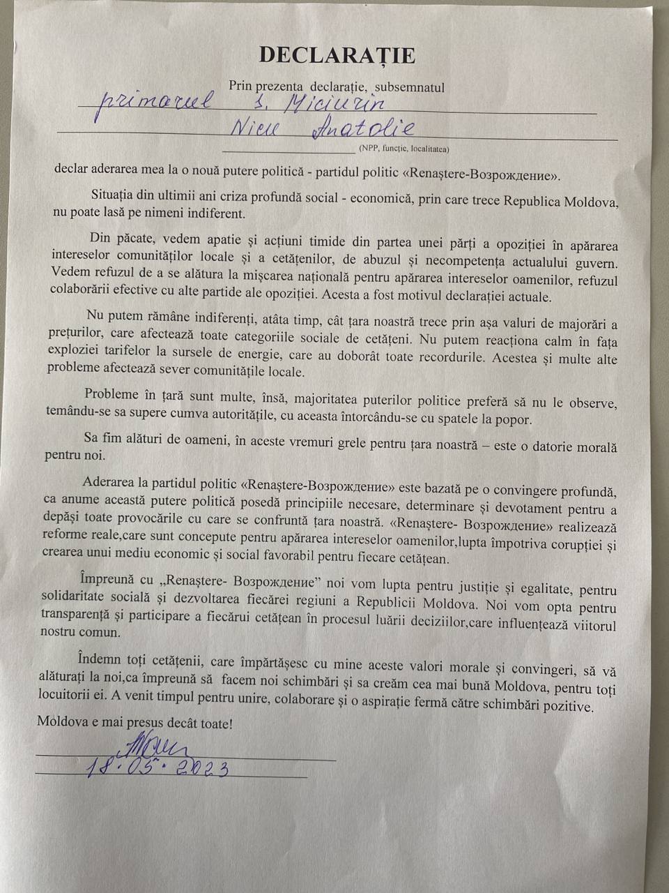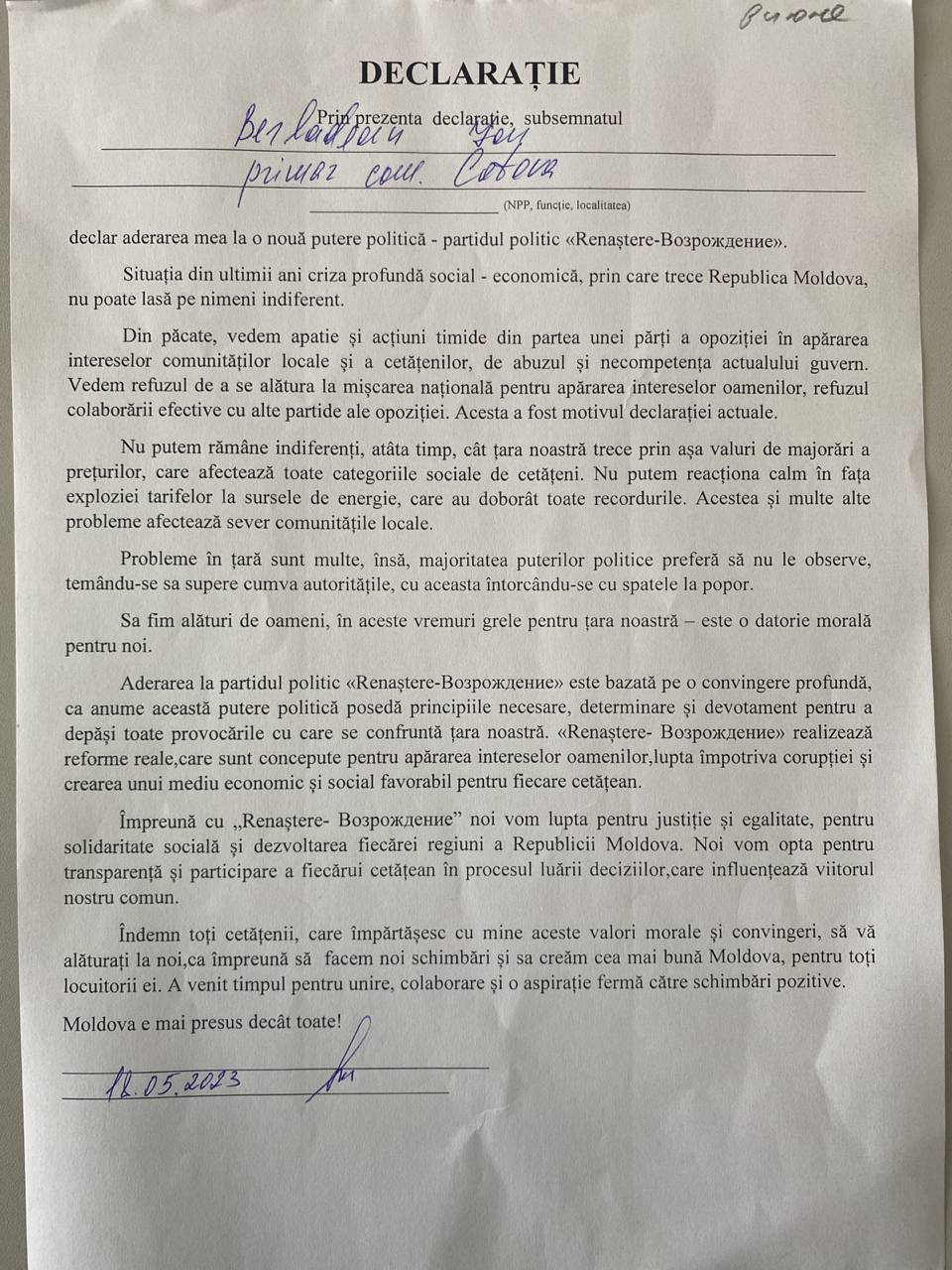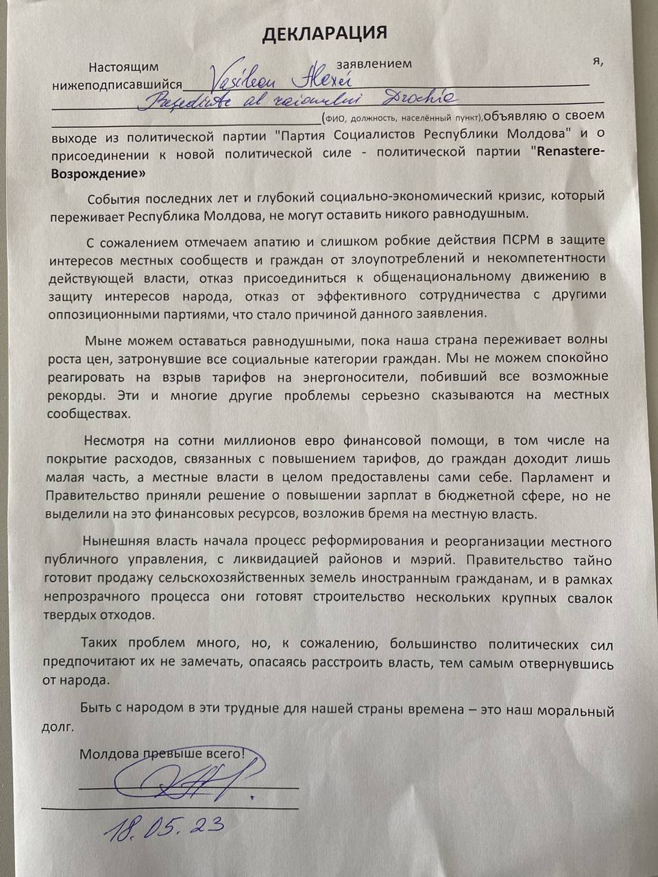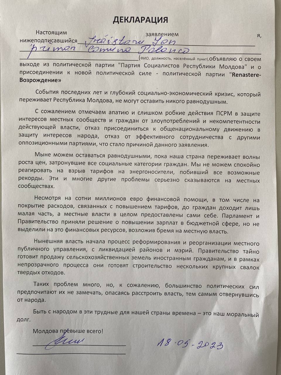 Continuă plecările din PSRM spre Partidul „Renaștere”. Președintele raionului Drochia, împreună cu cinci primari din raion, dar și consilieri raionali și orășenești din Drochia, au părăsit socialiștii și au aderat la Partidul “Renaștere”.