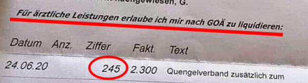 Această listă GOÄ poate fi găsită ușor pe Internet, iar indicele 245 se referă la niște costuri suplimentare de igienizare pe care trebuie să le suporte pacientul asigurat la o casă de asigurare privată. Acest indice a fost introdus de comunitatea medicilor germani din mai anul curent, pentru a acoperi costurile suplimentare de asigurare a procedurii standard de igienizare în contextul pandemiei de coronavirus (schimbarea măștilor de protecție după consultarea fiecărui pacient, utilizarea soluțiilor dezinfectante, folosirea combinezoanelor în cazuri mai grave etc.). Cu alte cuvinte, ca să nu obligi fiecare pacient să vină de acasă cu propriile materiale de igienizare, pacientul consultat de medic achită separat pe factură aceste costuri, acestea neavând nicio legătură cu testul pentru coronavirus propriu-zis, pentru care pacientul trebuie să plătească separat, o sumă separată mult mai mare.