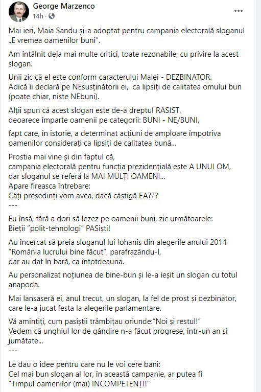 “Mai lansaseră ei, anul trecut, un slogan, la fel de prost și dezbinator, care le-a jucat festa la alegerile parlamentare. Vă amintiți, cum pasiștii trâmbițau oriunde: ”Noi și restul!” Vedem că unghiul lor de gândire n-a făcut progrese, într-un an și jumătate… Le dau o idee pentru care nu le voi cere bani: Cel mai bun slogan al lor, în această campanie, ar putea fi ”Timpul oamenilor (mai) INCOMPETENȚI!”, conchis Marzenco.