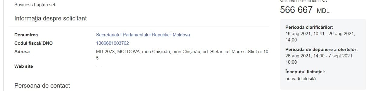 Parlamentul a anunțat licitație pentru procurarea a 25 de laptopuri de tip business. În acest scop s-au alocat 566 667 lei, ceea ce ar însemna că fiecare calculator va costa peste 22 de mii de lei.